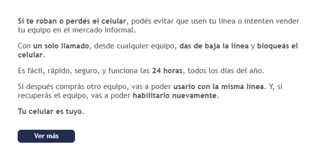 El texto del correo explica que “Si te roban o perdés el celular, podés evitar que usen tu línea o intenten vender tu equipo en el mercado informal».