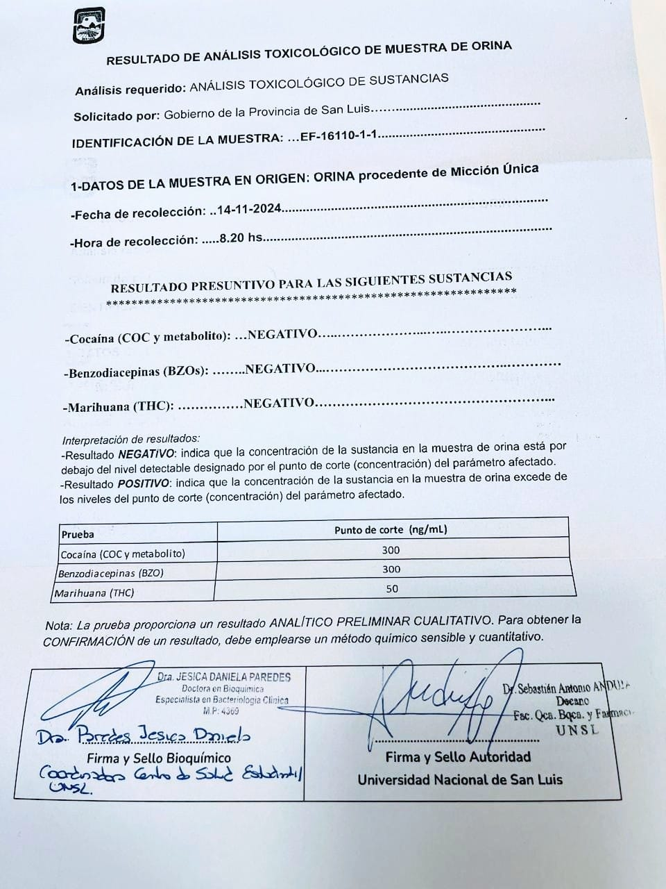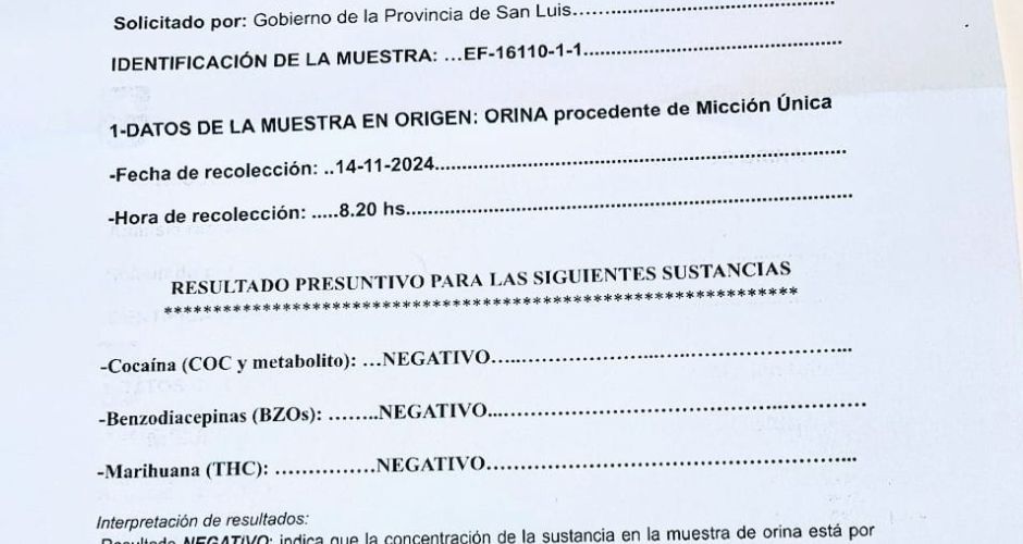 Ayer el gobernador de San Luis, Claudio Poggi, informó los resultados del examen toxicológico que se realizó el pasado jueves en un laboratorio perteneciente a la Universidad Nacional de San Luis.