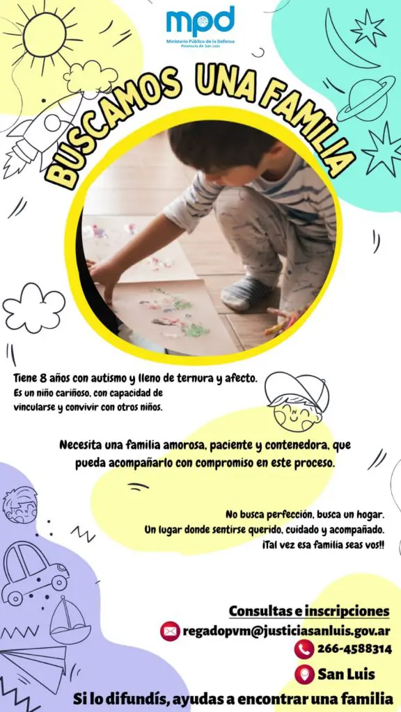 El Ministerio Público de la Defensa y el Registro Único de Postulantes para Adopción (RUA) continúan con la convocatoria pública y abierta de adopción para encontrar una familia “amorosa, paciente y contenedora”, que pueda acompañar con compromiso a un niño de 8 años con TDH y autismo y “lleno de ternura y afecto”.