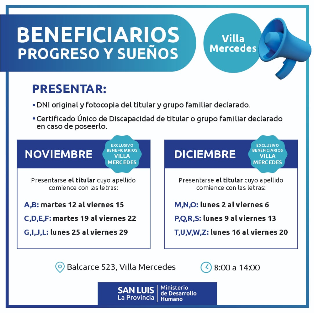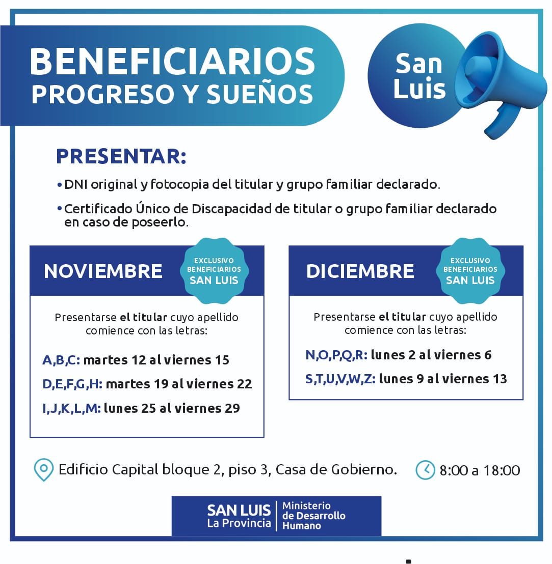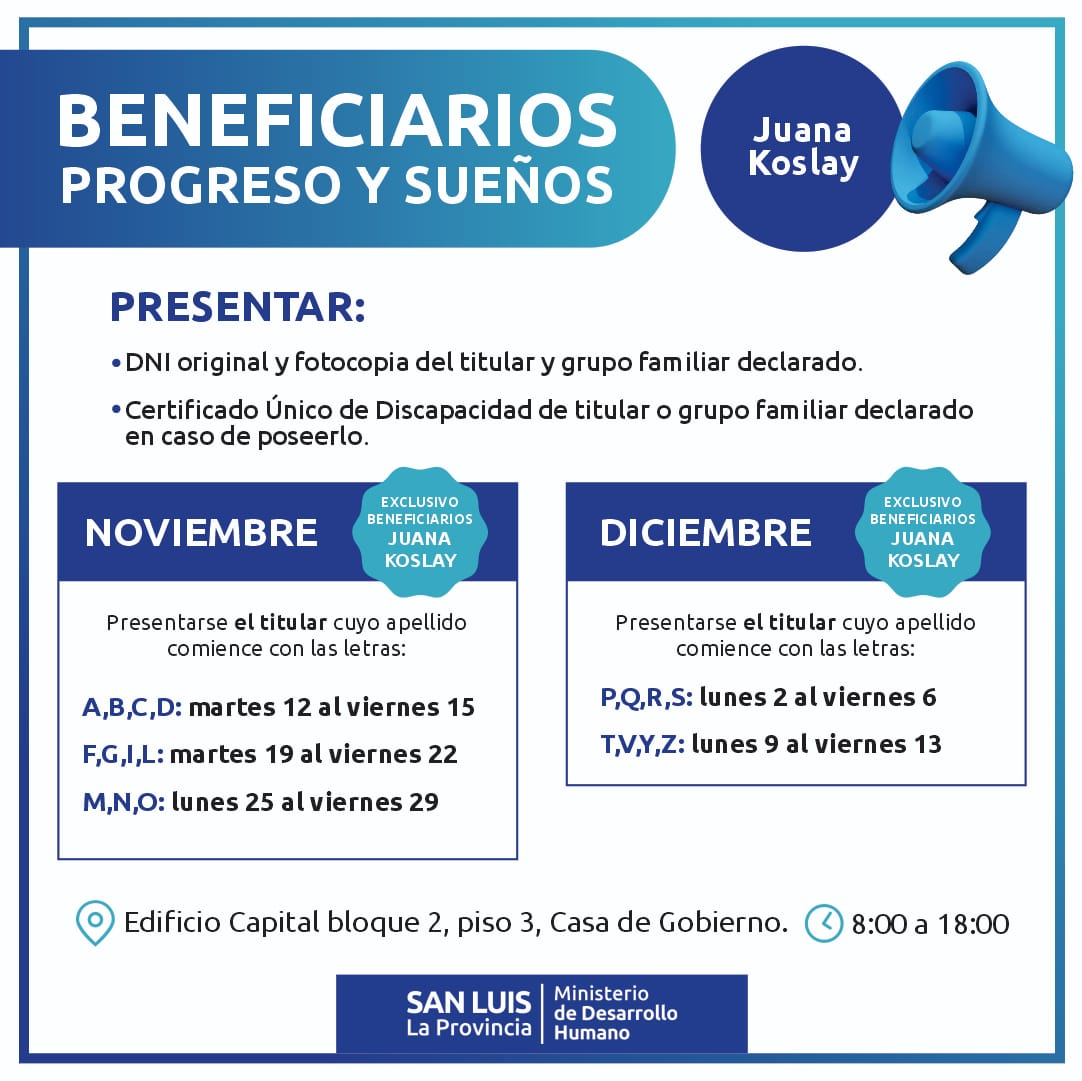 La funcionaria informó lugar y horario para que los beneficiarios acerquen los papeles a partir de este martes 12. En San Luis será en el Edificio Capital de Casa de Gobierno, bloque 3, piso 3. “Allí vamos a recibir la documentación que necesitamos de los beneficiarios de la ciudad de San Luis y de Juana Koslay, de 08:00 a 18:00”, detalló. En Villa Mercedes, los preadjudicatarios deben acercarse a la Oficina de Vivienda y Regularización Dominial, en Balcarce, 523, de 08:00 a 14:00, puntualizó.